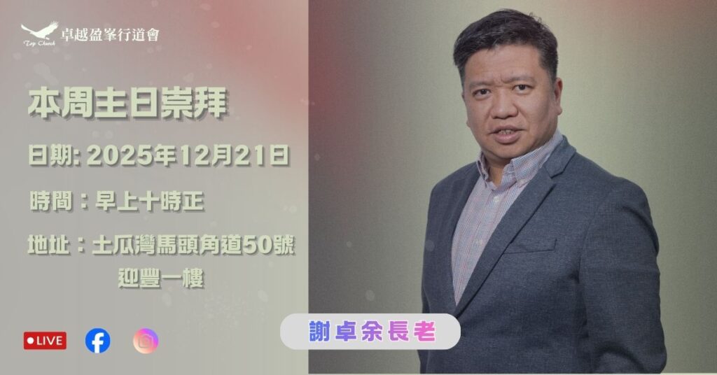 本周主日崇拜 日期:2025/12/21(日) 時間:早上十時正 地點:九龍土瓜灣馬頭角道50號迎豐一樓 講員 […]